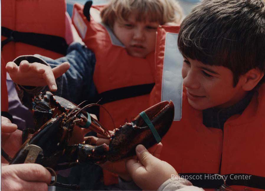 A photo view of two boys looking at a lobster. 5/24/1989.