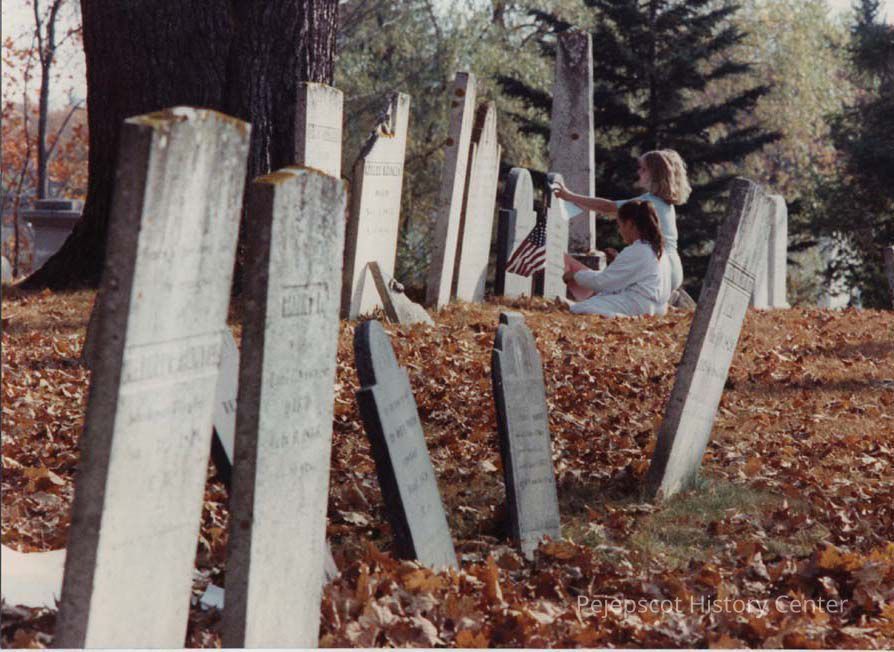 A photo view of two children doing a rubbing of a gravestone. 10/27/1989.