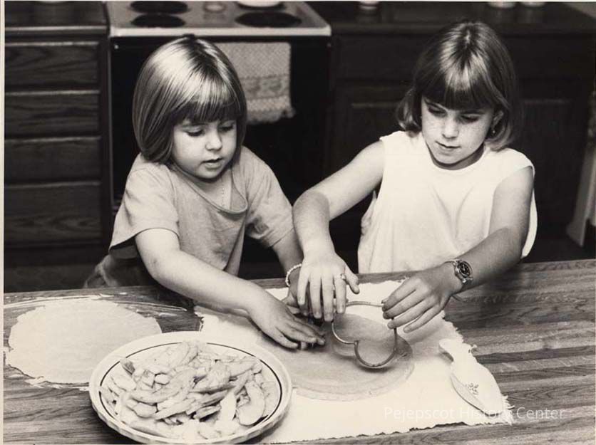 A B/W photographic view of two children making heart shaped cookies. This photo was published 9/25/1992.