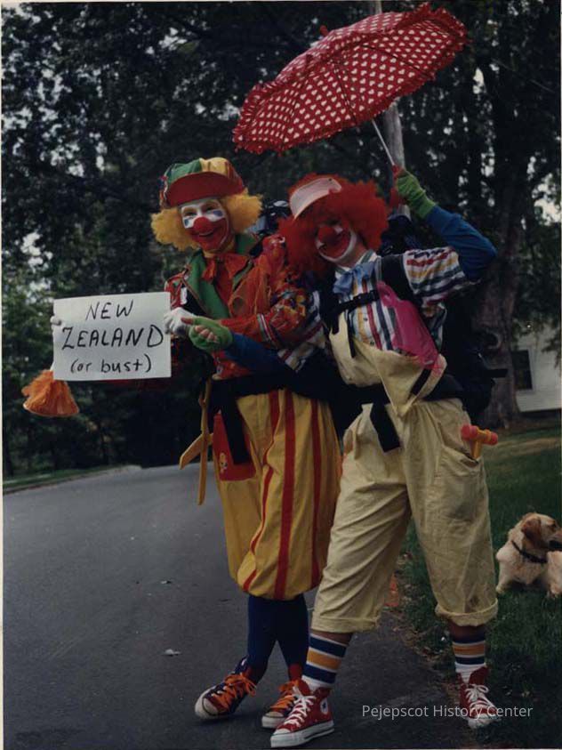 A photo view of two clowns hitch hiking. 7/5/1988.