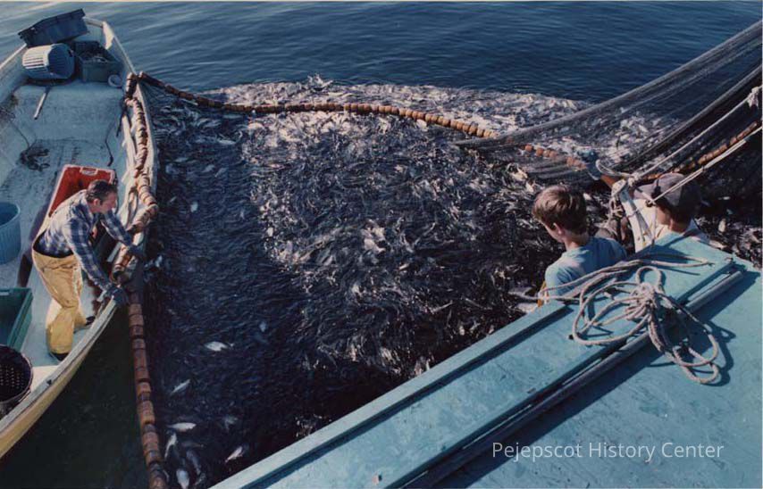 A color photographic view of two fishermen at Lowell Cove catching Pogies in a net. This photo was published 4/8/1992