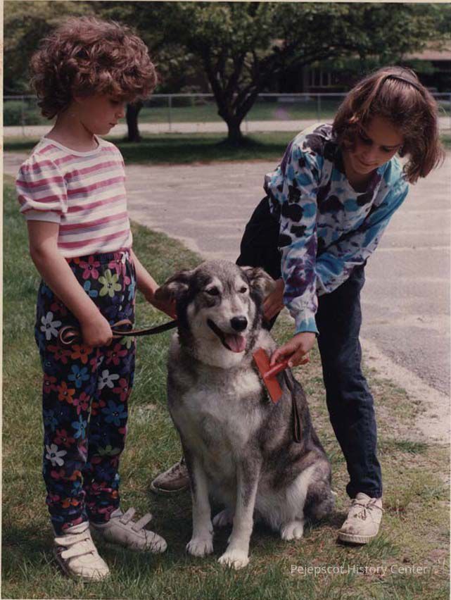 A B/W photographic view of two little girls, Jordan and Katie Mora, and a dog named Shadowfax. This photo was published 6/8/1992.
