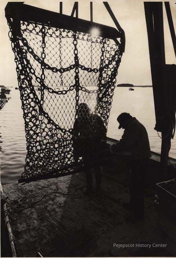 A photo view of two men securing a scallop drag.