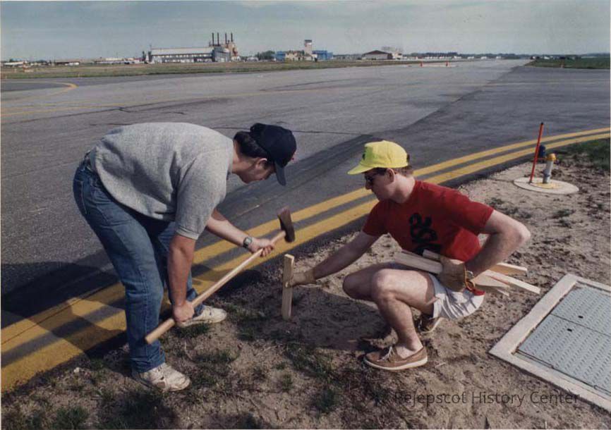 A color photographic view of two people putting out surveyor stakes at BNAS. This photo was published 5/17/1991.