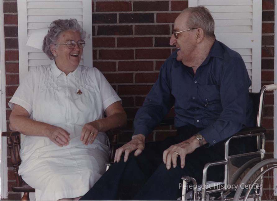 A color photographic view of two people sitting, one is a nurse and the other is a man in a wheel chair. This photo was published 9/20/1989.