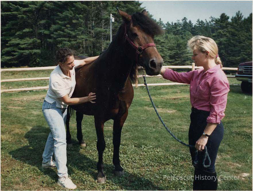 A photo view of two women working with a horse. 9/12/1991.
