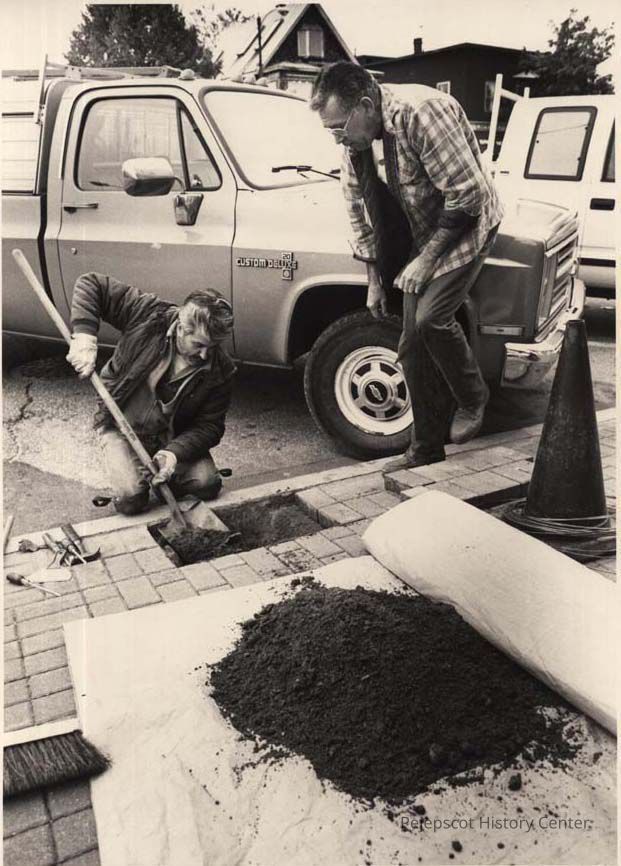 A B/W photographic view of two workmen from Favereau Electric Co. working on Maine Street. This photo was published 10/21/1992.