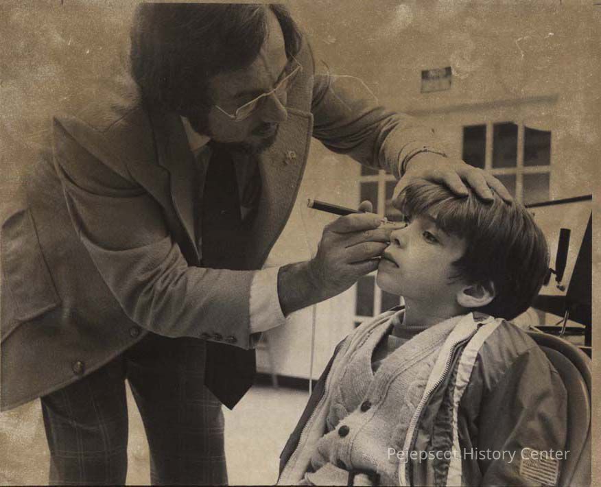 A B/W photographic view of unknown. Marked on back, "Testing for eye disease." This photo was published 4/8/1975.