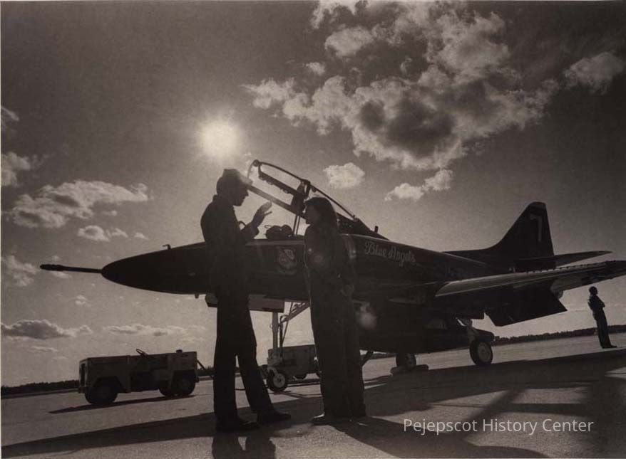A B/W photographic view of Virginia Wright talking to a sailor. This photo was published 8/19/1982.