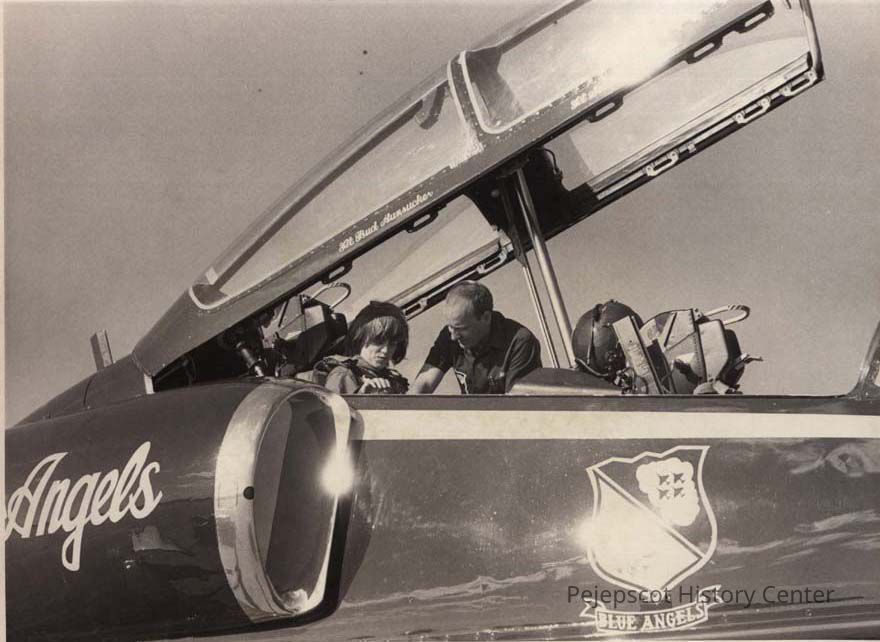 A B/W photographic view of Virginia Wright in the cockpit of a "Blue Angels" plane. She is a writer for the Times Record. This photo was published 8/19/1982.