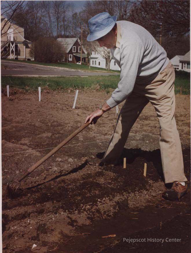 A photo view of Walter Cucci raking in his garden. 5/23/1988.