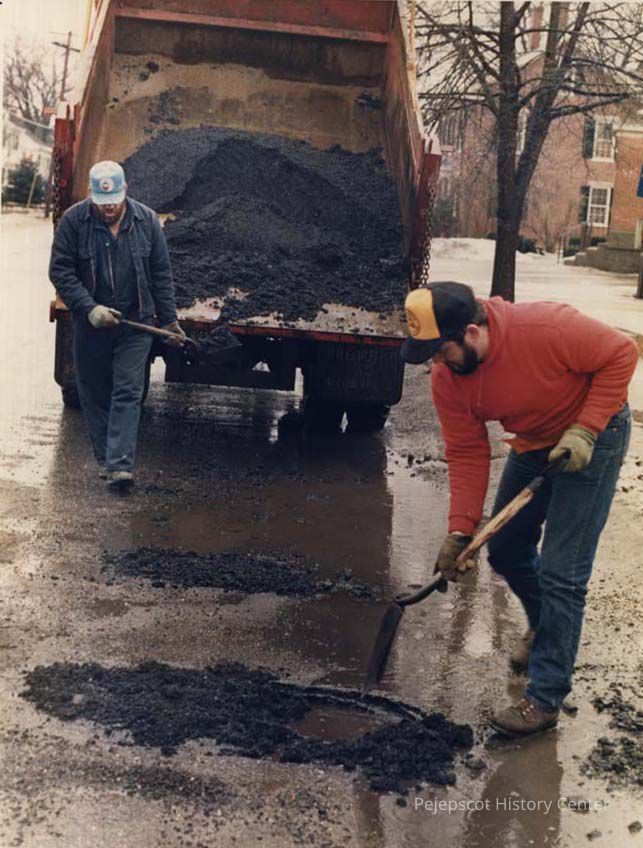 A color photographic view of two workmen patching potholes. This photo was published 2/24/1989.