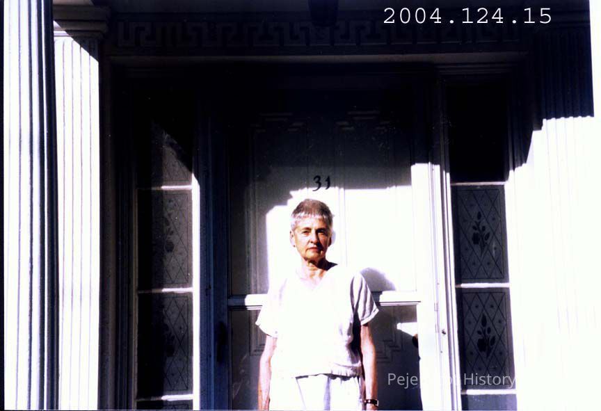A color photograph of Gregor Gamble (a PHS volunteer) standing in front of her door at 31 Federal Street. 2001