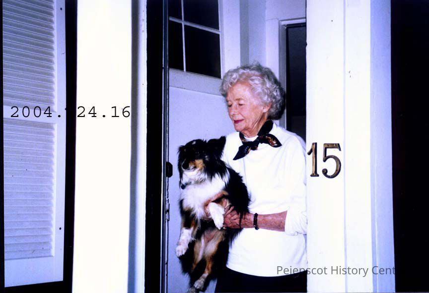 A color photograph of Sophia Piefer standing in her doorway at 15 Franklin Street. She is holding a dog.