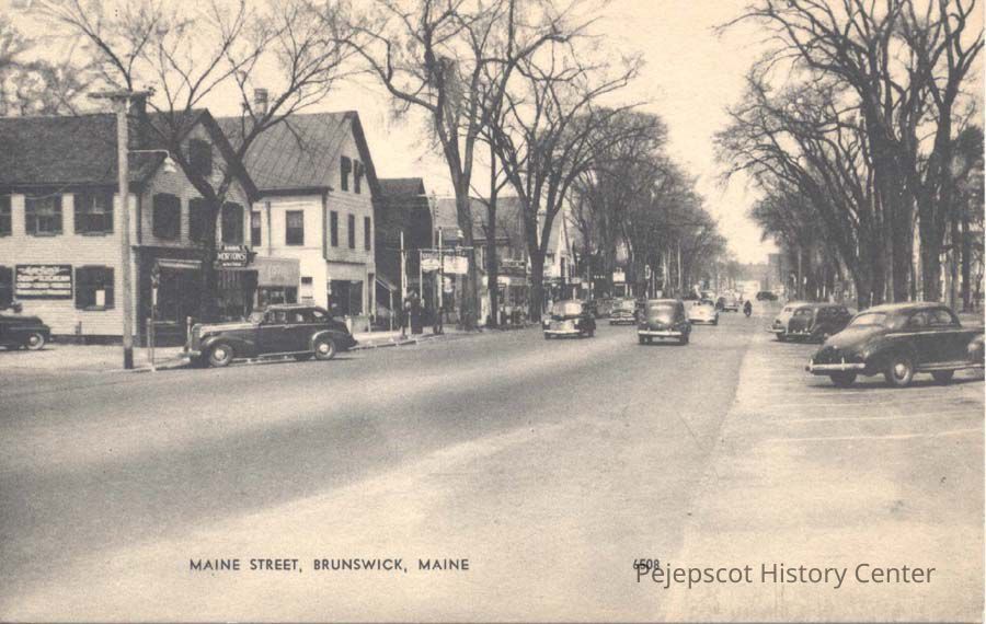 A picture postcard of Maine Street from near the Mall. The postcard is postally unused.