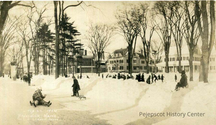 A B/w picture postcard of people skating and sliding on the Mall. The Skolfield-Whittier House can be seen in the background.