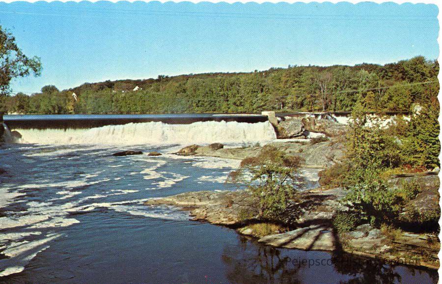 A color postcard of the Androscoggin River Falls at Brunswick/Topsham. The Androscoggin has its start in the Rangeley Lakes area. It winds its way into NH then back into ME. Here, you see it as it approaches the coast at Brunswick/Topsham, ME.