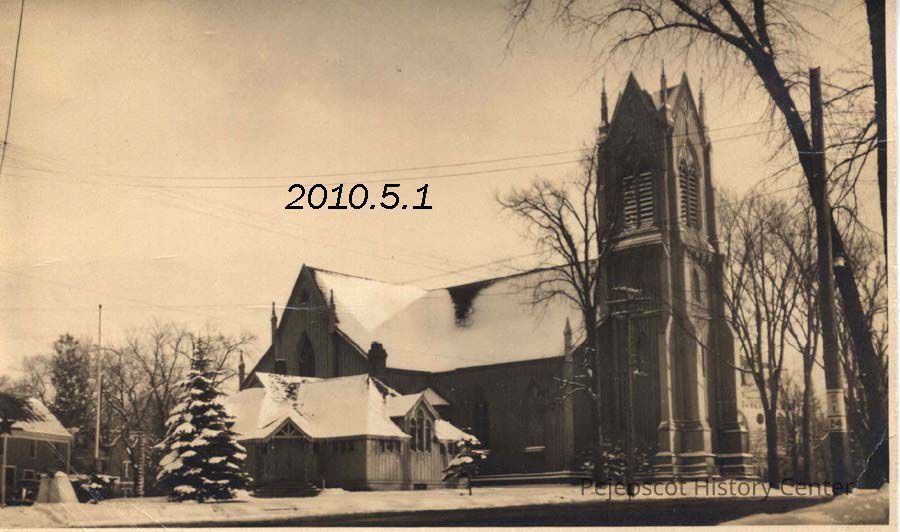 A B/W picture postcard of the First Parish Church in the winter time.