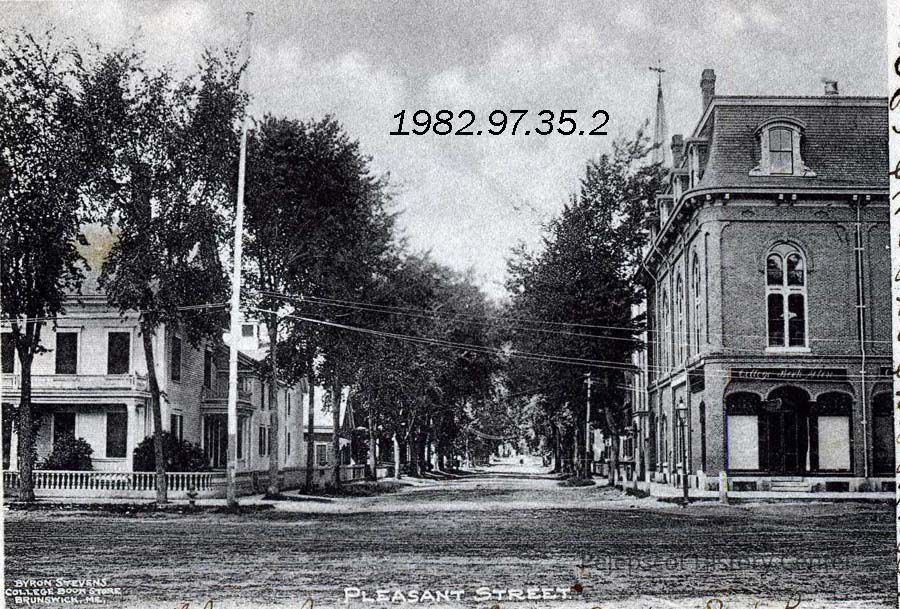 A B/W picture postcard view of Pleasant Street at it's intersect with Maine Street.