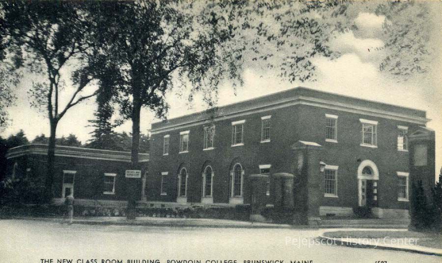 A B/W picture postcard view of Sills Hall, Bowdoin College. McKim, Reed (?), and White Architects. Text reads "The new class room building, Bowdoin College, Brunswick, Maine".Collection