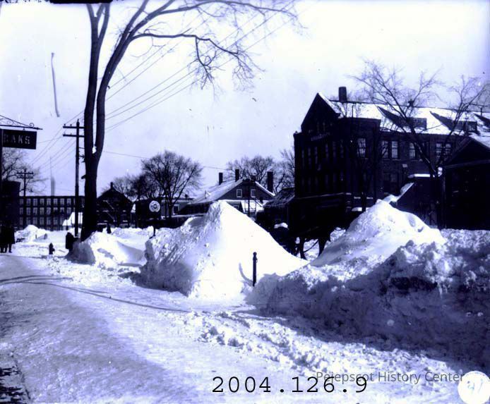 A B/W photograph of Maine Street, Brunswick, looking north towards Fort Andross building. There are big piles of snow in the street.