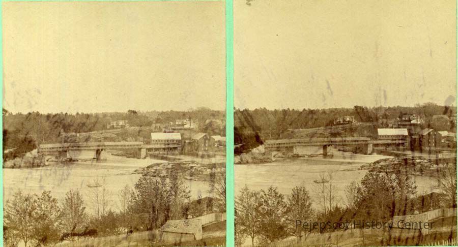 A B/W steroopticon view of a bridge over the Androscoggin River taken from high ground in Topsham.