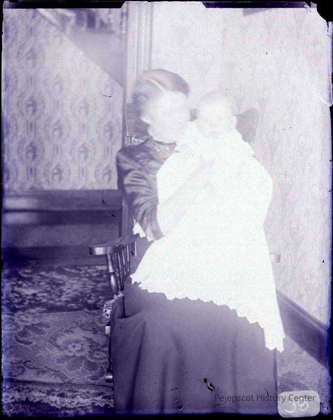 A woman in a rocking chair holding a baby. This is similar to 2009.386.37.
