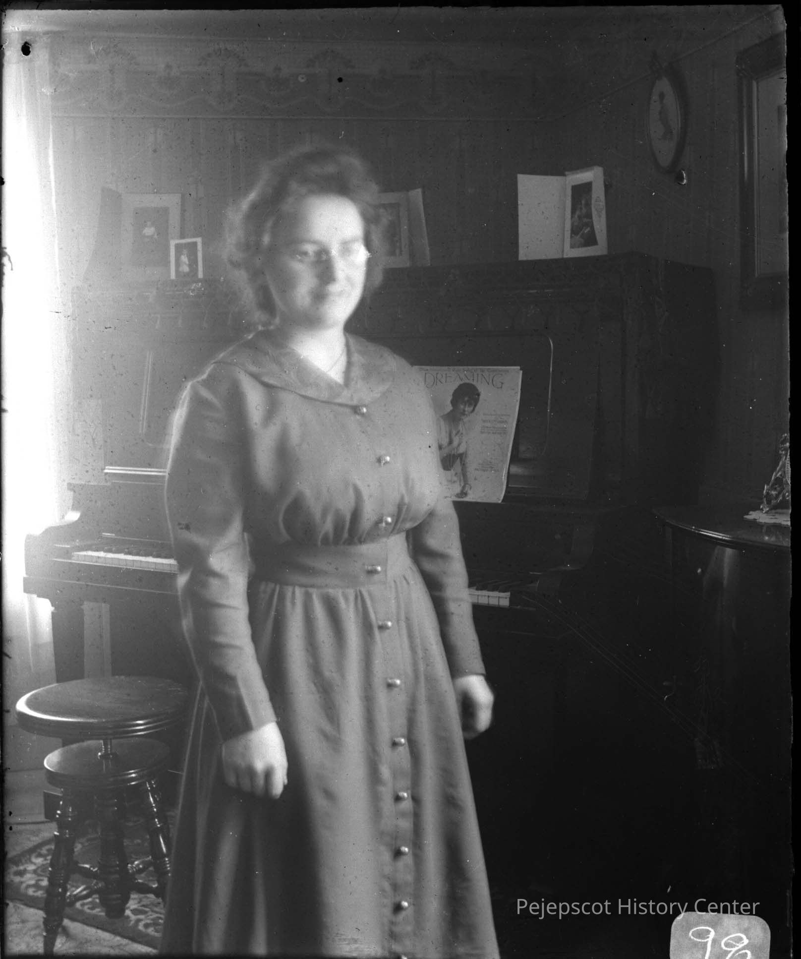 A negative view of a woman standing in front of a piano.