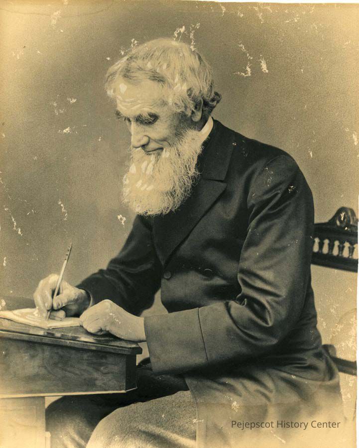 A black and white matted photograph of Aaron Dennison, one of the founders of Dennison Manufacturing Co. and brother to Eliphalet. Dennison is seen here writing at a writing desk. Undated.