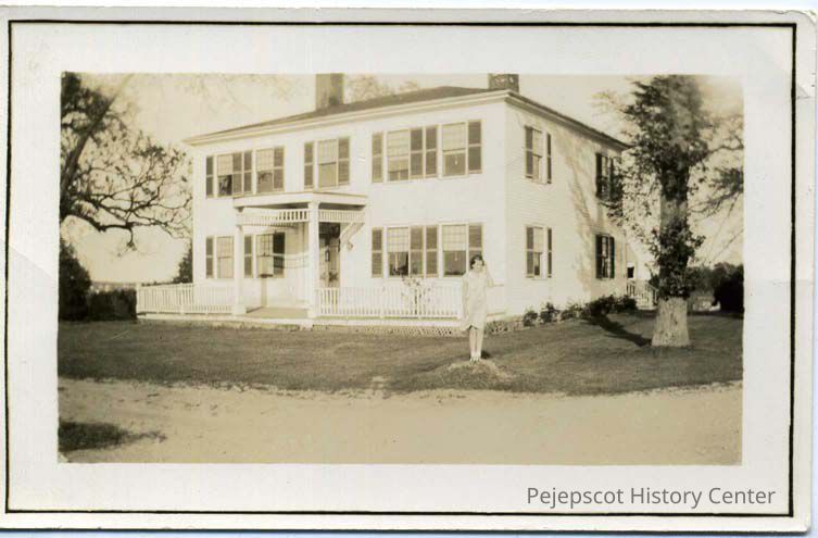 A black and white photograph of the house of Abijah Stover taken on May 30,1933. Standing in front of the house is Mrs. Toothaker's grand-niece.
