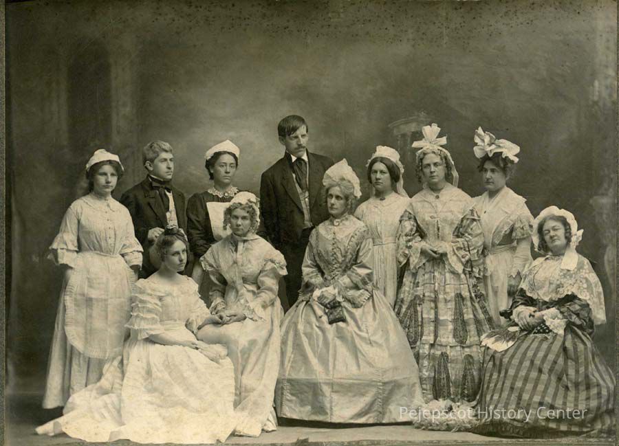 A B/W photograph of 9 women and 2 men in costume for a play. From Miss Anabel Stetson.