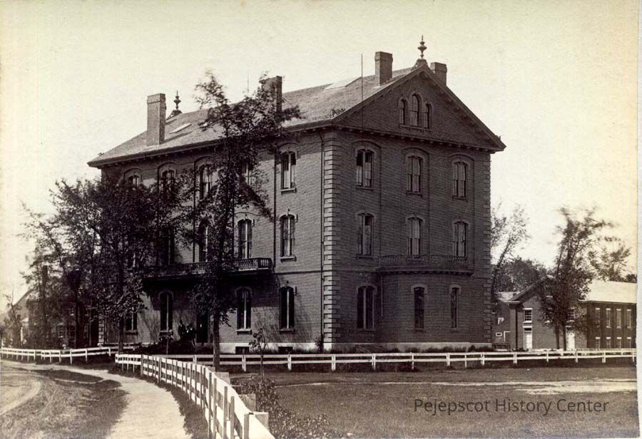 An undated black and white photo of Adams Hall at Bowdoin College in Brunswick, Maine. Photo shows the road that went through the campus in the 1830s.
