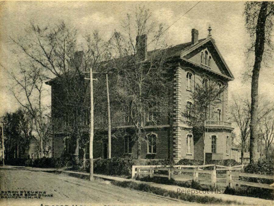 A picture postcard view of Adams Hall. At one time home to the Medical School of Maine. Inscribed on postcard as "Byron Stevens / College Book Store / Brunswick, ME." Dated 08/14/1936.