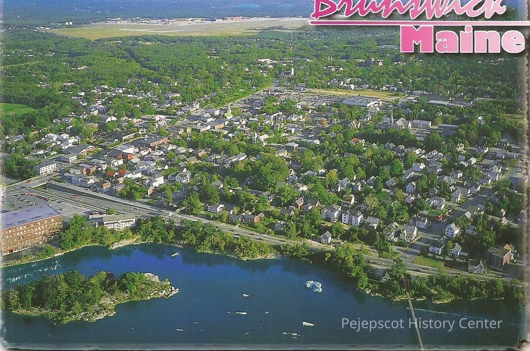 A aerial color picture postcard of Brunswick, especially where Route 1 runs along the river. There are 2 unused copies