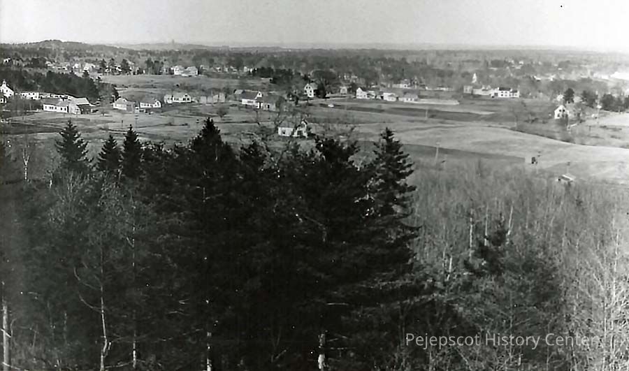 A aerial B/W photograph of the Brunswick side of the Androscoggin River, taken from overhead at Topsham.