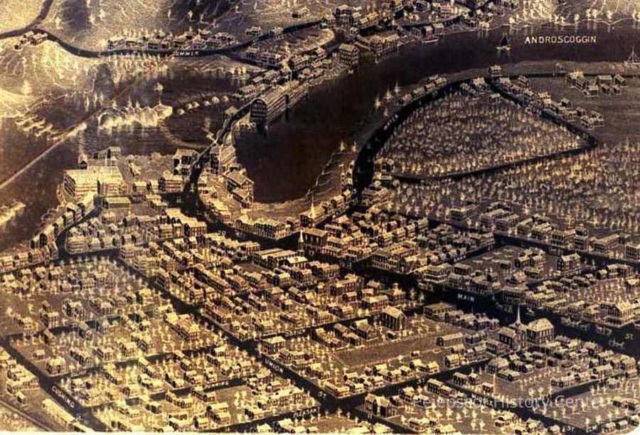 A colored slide of a print of an aerial view of Brunswick. Undated