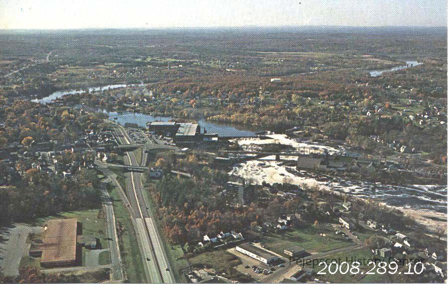 A color picture postcard aerial view of Brunswick looking up river above Route 1. The Cabot Mill can be seen in the distance. Postcard unused. UndatedCollection