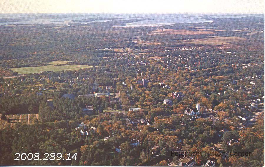 A color picture postcard aerial view of Brunswick looking south from near the First Parish Church. Bowdoin College and it's athletic fields can be seen as well as Casco Bay in the distance. UndatedCollection