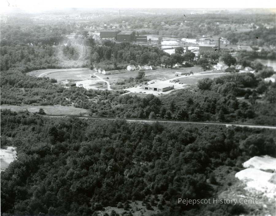 A B/W aerial photograph of Brunswick from the northeast showing the Town Garage before the construction of the Route 1 bypass. Undated