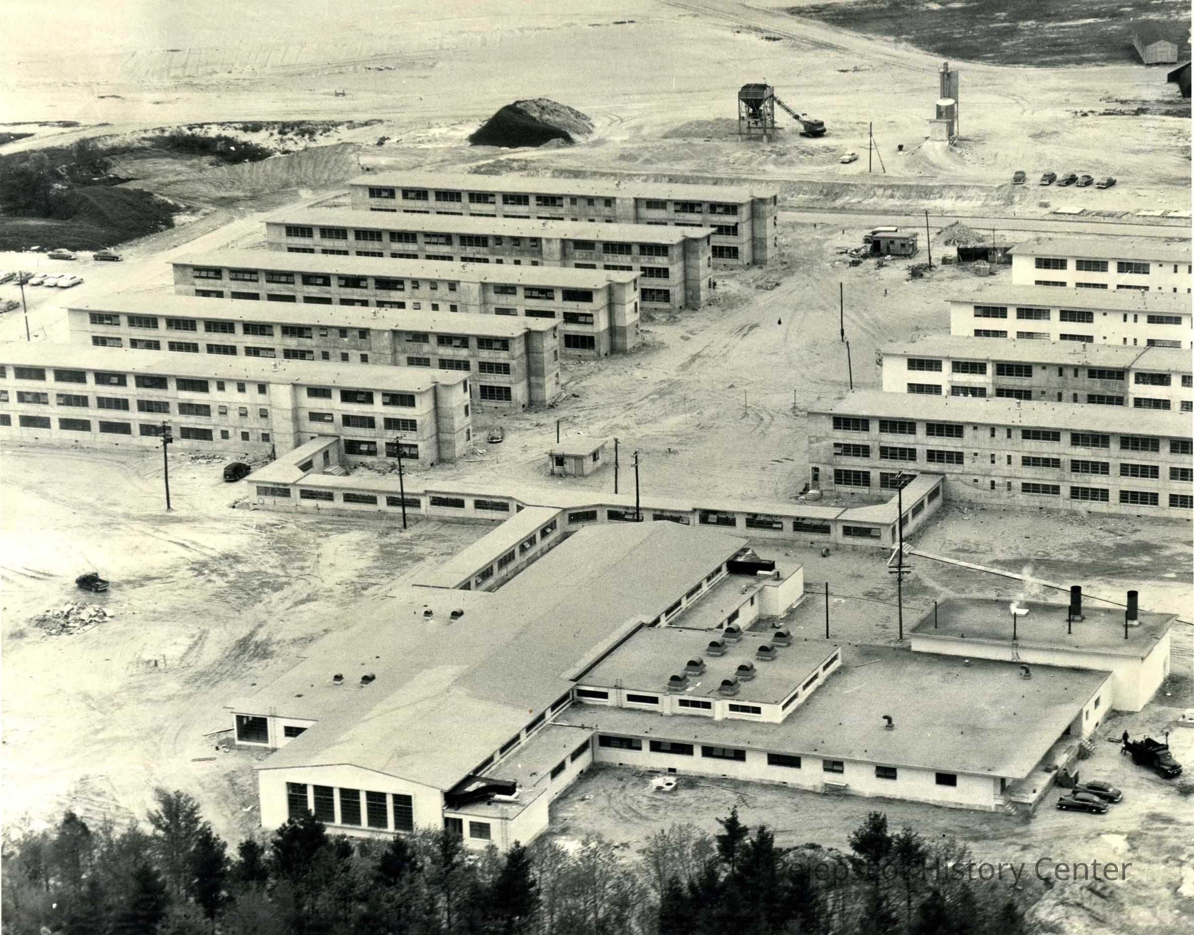 A B/W aerial photograph of the barracks at the Brunswick Naval Air Station. Undated