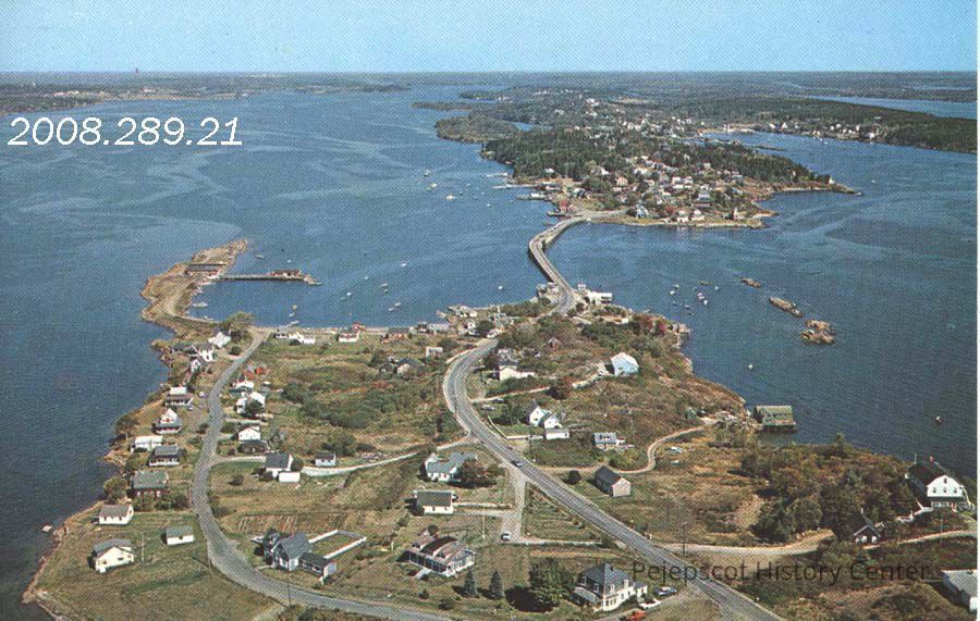 A color picture postcard of an aerial view of Orr's and Bailey Islands. It is looking from the north end of Bailey Island towards Orr's Island and the Cribstone Bridge. UndatedCollection