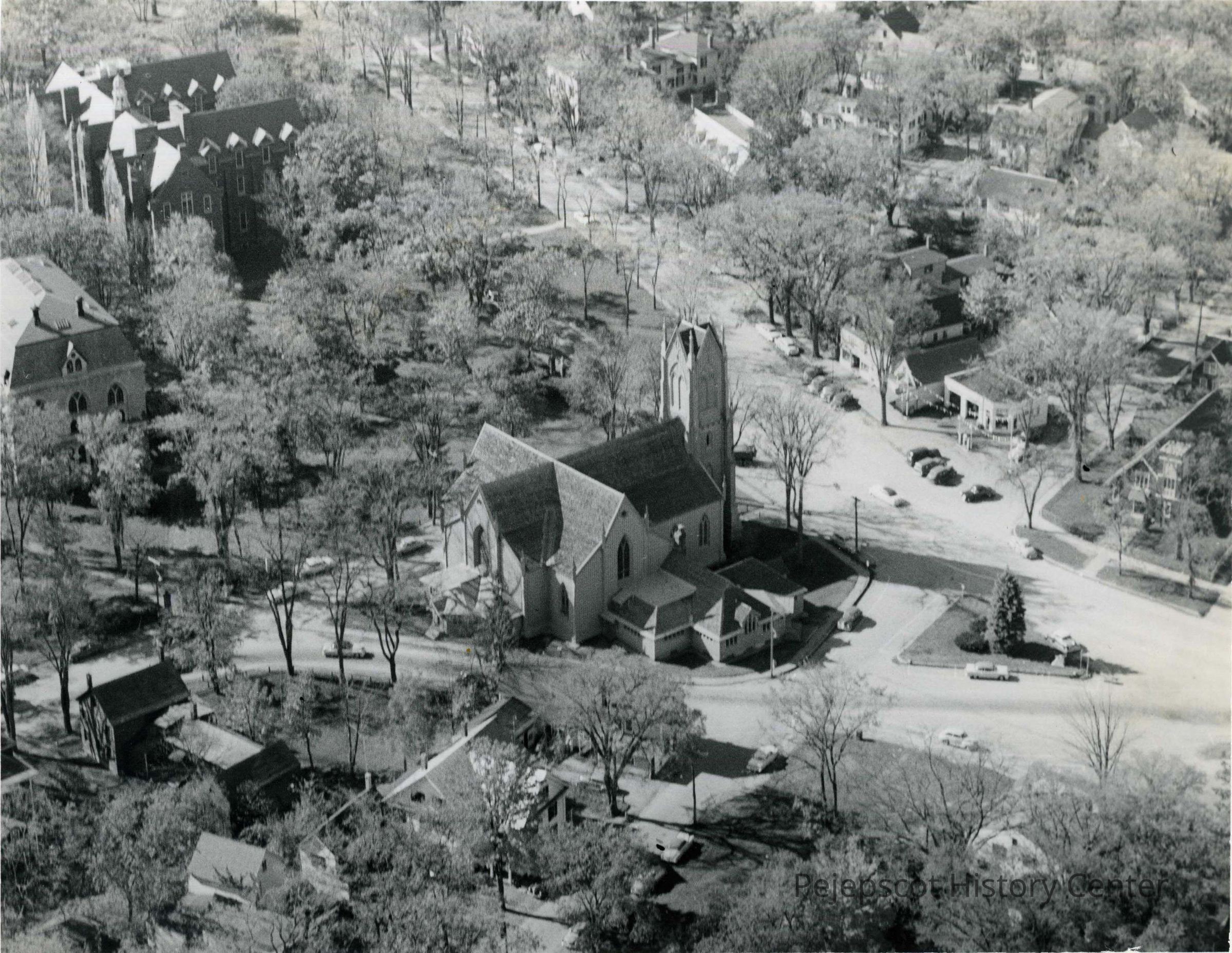 A B/W aerial photograph of the First Parish Church and part of Bowdoin College. Undated