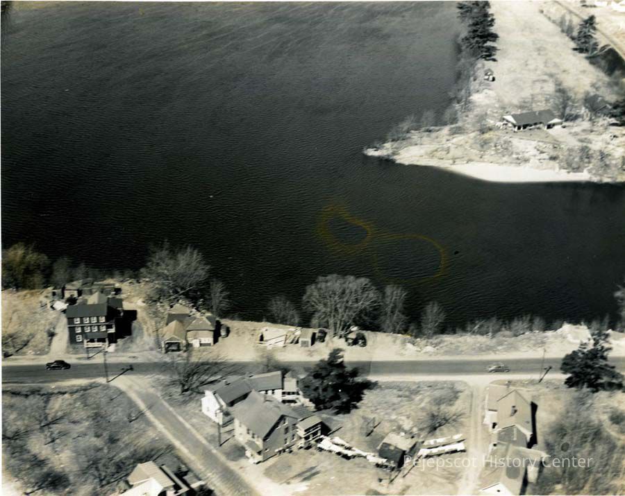 A B/W aerial photograph of the intersection of Mill and Cumberland Streets with the Androscoggin River in the background. Undated