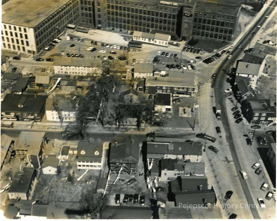 An aerial view of the north end of Maine Street. The Cabot Mill and Mill Street can be seen. Undated