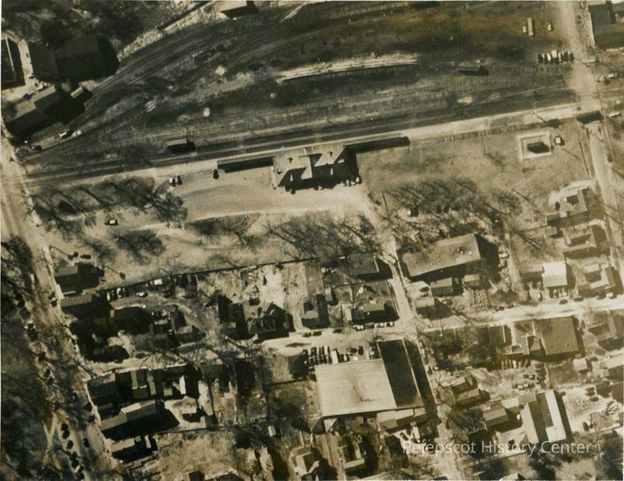 A B/W aerial photograph of the railroad station and Eagle Hotel in Brunswick. Undated