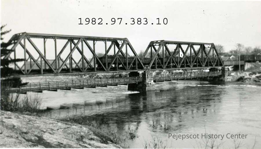A B/W photograph of the Black Bridge (upper railroad bridge) with railroad cars parked on it to stabilize it during 1936 flood.