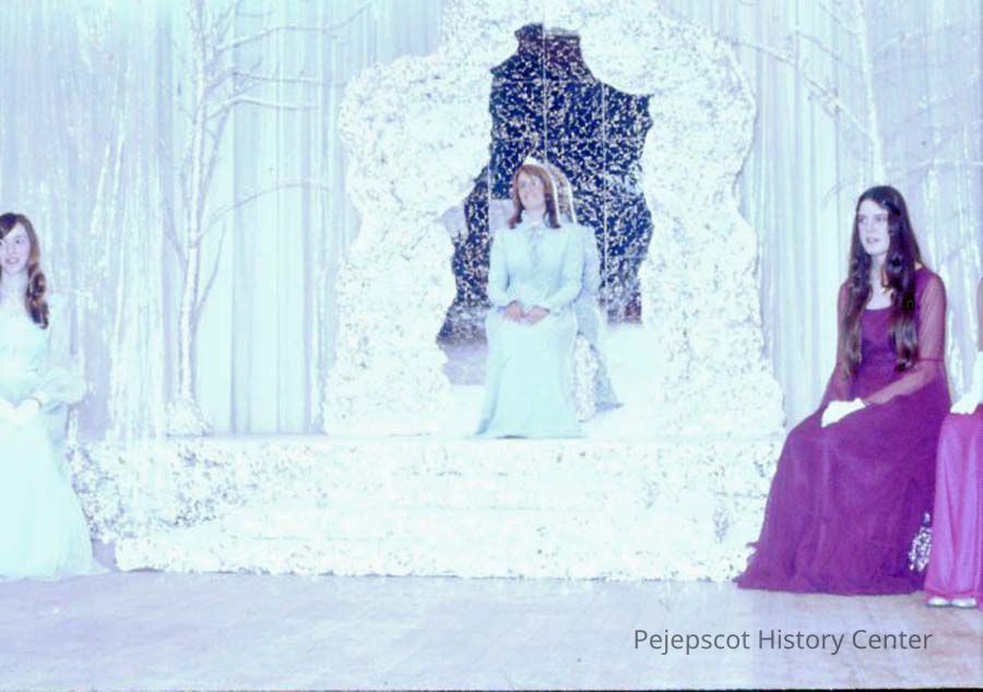 A 35 mm color slide of a queen in the 1973 Miss Teen Queen Pageant. Agnes Racine, the 1972-73 Teen Queen is seated center stage. On the left is contestant Mary Anne Licameli. On the right is contestant Barbara Aldridge. The slide is marked, "6", and in blue ink, "6-96"and in red ink, "2-62". Undated