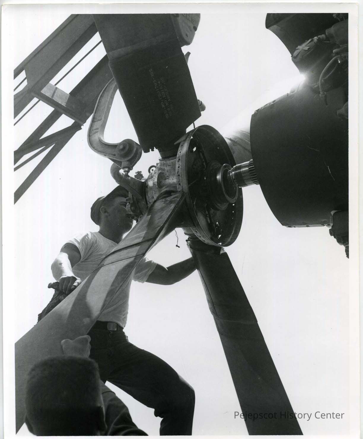 An official U.S. Navy photo of a man working on an airplane. The text reads; "Aircraft maintenance was performed with a minimum of delay, and the quality of the work showed the pride of the workers in a job well done. RELEASED BY LTJG KURT P. SCHNEIDER" Undated