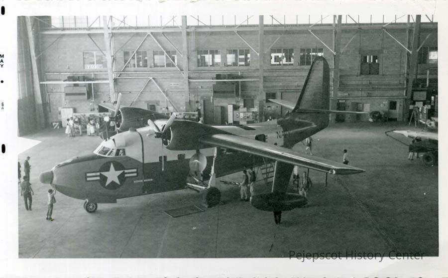 B/W photo of an airplane in a hanger at Brunswick Naval Air Station, May 1960. UH-16 Albatross, Air Search Rescue Aircraft