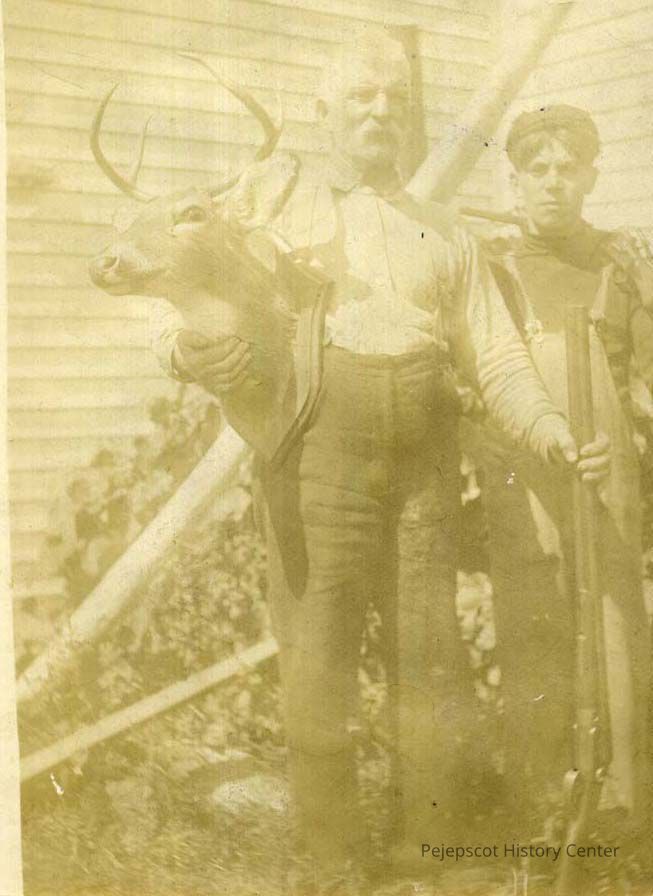 A B/W photograph of Albert Caron and an unidentified boy. Albert is holding a stuffed deer head in one hand and a large caliber rifle in the other. Undated